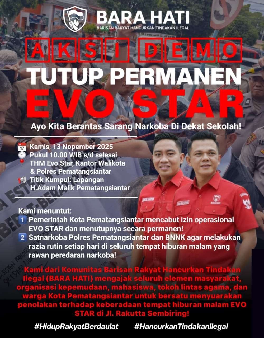 Pematangsiantar,sosio info. Com— Komunitas Barisan Rakyat Hancurkan Tindakan Ilegal (BARA HATI) akan menggelar konferensi pers besar pada Rabu, 5 November 2025 pukul 20.00 WIB di Sobat Cafe, Jl.Adam Malik, Kota Pematangsiantar. Dalam agenda tersebut, BARA HATI akan membacakan surat terbuka yang ditujukan kepada Presiden Republik Indonesia H. Prabowo Subianto, Wakil Presiden Gibran Rakabuming Raka, Kapolri Jenderal Listyo Sigit Prabowo, Komisi III DPR RI, Kapolda Sumatera Utara Irjen Pol. Agung Setya Imam Effendi, serta Gubernur Sumatera Utara Bobby Nasution. Surat terbuka ini berisi desakan agar pemerintah dan aparat hukum segera menutup permanen tempat hiburan malam Evo Star, yang diduga kuat menjadi sarang peredaran narkoba jenis pil ekstasi di Kota Pematangsiantar.
