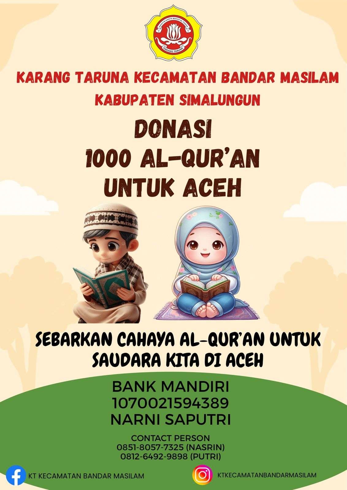Jadilah bagian dari perubahan. Untuk informasi penyaluran donasi Al-Qur’an maupun bantuan lainnya, masyarakat dapat menghubungi sekretariat atau pengurus Karang Taruna Kecamatan Bandar Masilam, Kabupaten Simalungun.