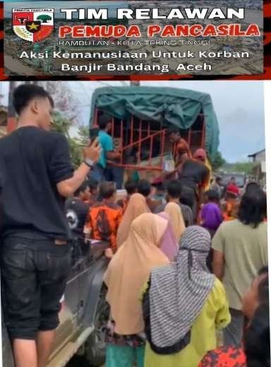 Tim Relawan Pemuda pancasila kota tebing tinggi,turutt hadir membawa kebutuhan tubuh dan kebutuhan sehari hari . Batuan tersebut akan di berikan kepada warga dampak banjir seperti, air mineral, Beras,baju baru dan bekas layak pakai , mie instan, jeket, pempers anak- anak, roti ,lilin ,alas tidur dan lain lainya.
